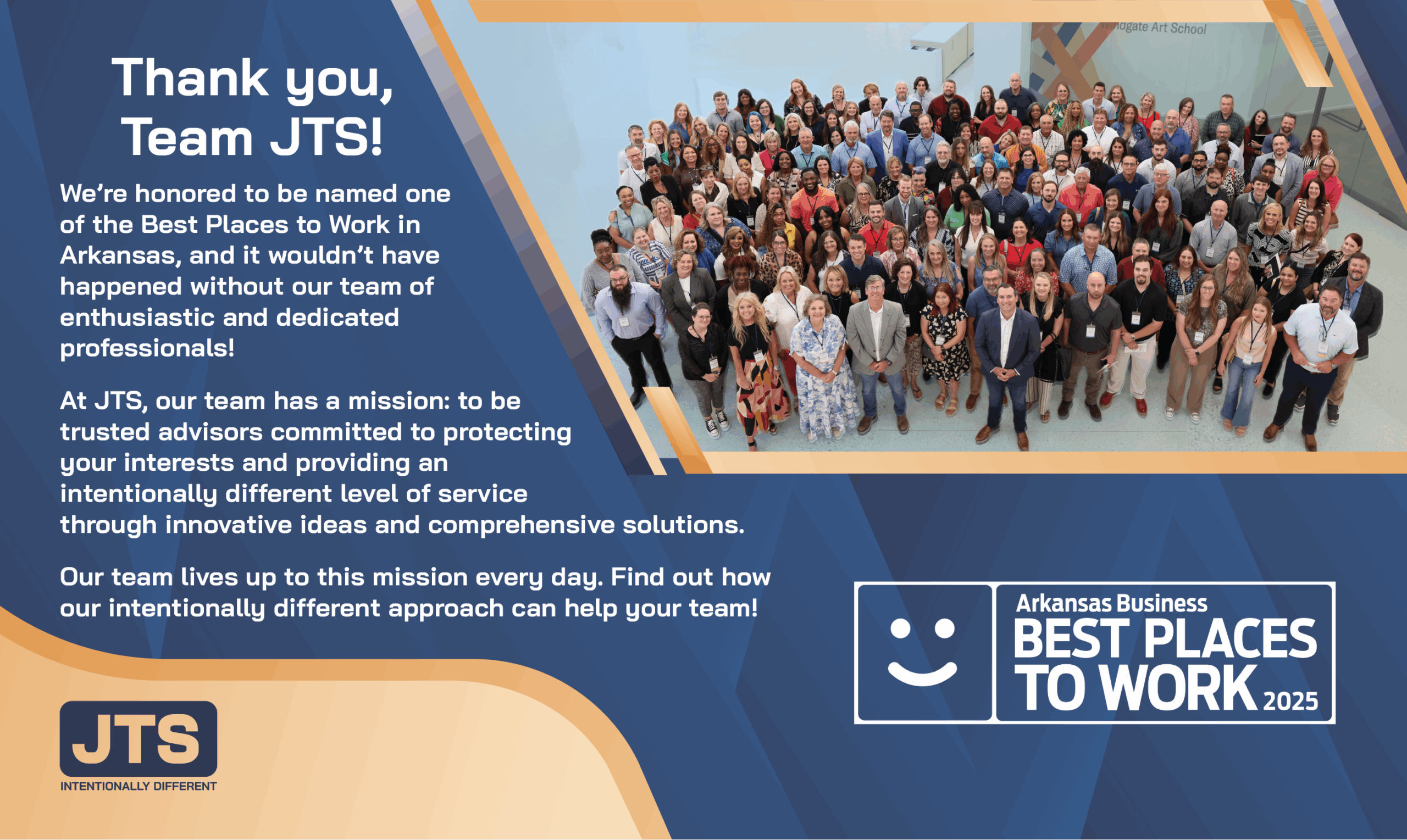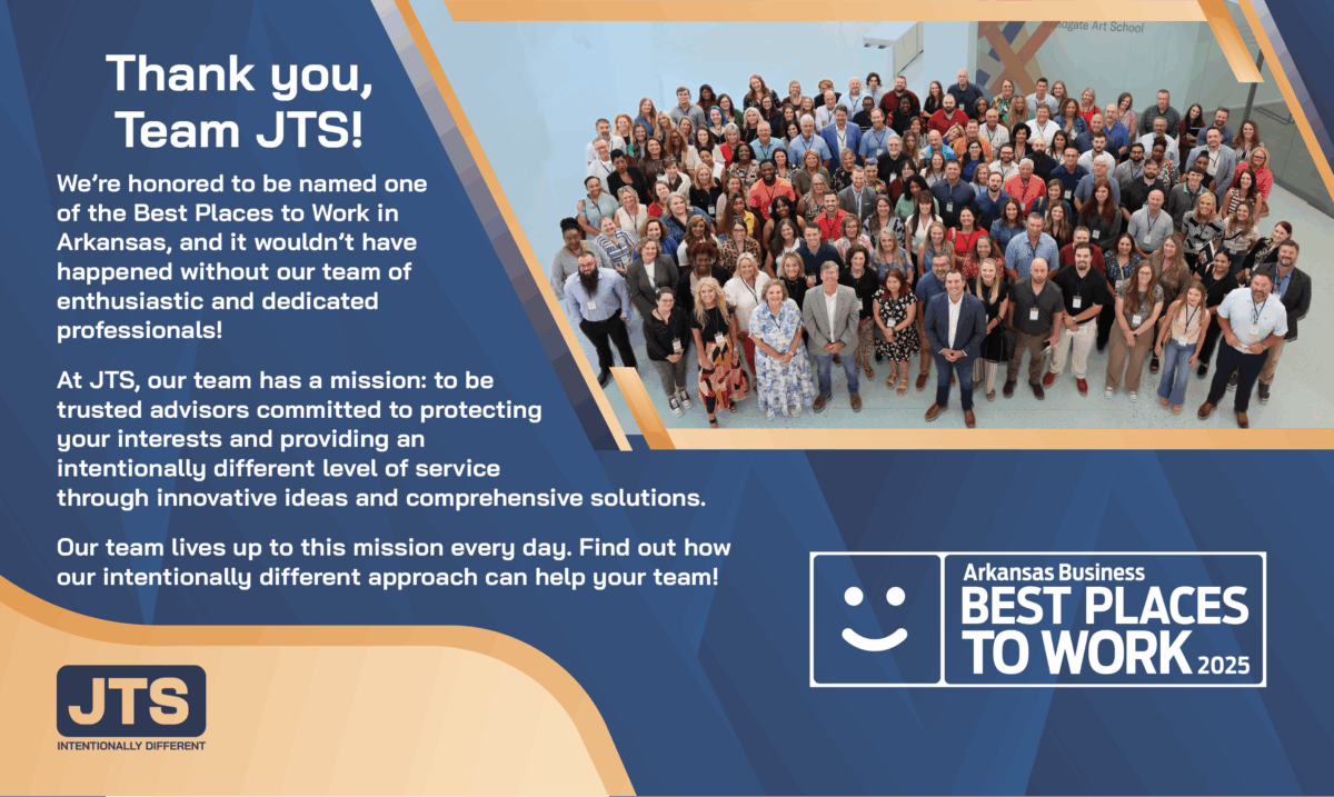 JTS was featured in a special Arkansas Business publication spotlighting the Best Places to Work in Arkansas. In describing the many reasons JTS made the list, the publication highlighted how, “employees are offered flexible schedules, with 8% of the company working remotely,” and a “wellness-forward environment supports staff in and out of the office, with health and dental coverage complemented by cancer insurance, estate planning support, chronic condition management and more.”